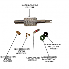 Kit completo di toglivalvole di servizio e ricambi per tubi flessibili gas climatizzatore Tecnogas COD.14151