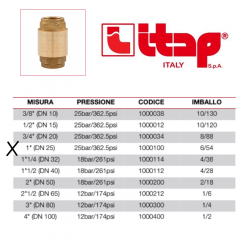 Valvola di ritegno da 1” F ITAP Mod. Europa per impianti idraulici, di riscaldamento, di condizionamento e pneumatici